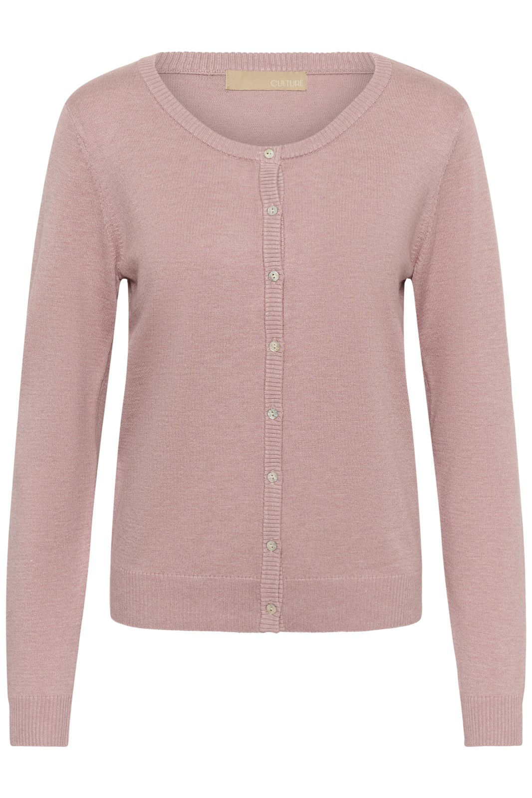 Blød og lækker Culture cardigan til basic garderoben. Den er gennemknappet med små fine perlemors knapper og har ribkant på en runde hals, ærmekant og bund kant.