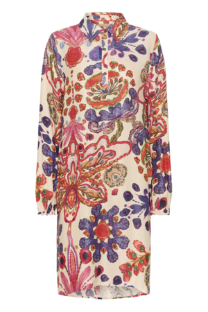 Smukkeste maxi kjole fra Culture. Kjolen har de skønneste glade farver i et flot mønster. Den har lange ærmer og en lang længde med lommer i siden. Kjoen har en flot v udskæring som slutter i en lille knude der giver fin detalje til kjolen. Perfekt til en af forårets festlige lejligheder.