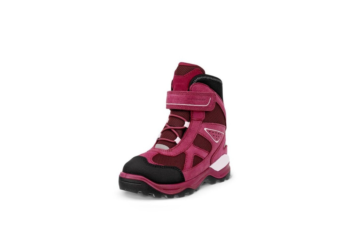 Flotte Ecco vinterstøvler i en super sød mørkerød med snefnug print. Støvlen er ruskind og tekstil og lukkes med velcrobånd over vristen, der gør det nemt at tage støvlerne af og på. Støvlerne har en fast hælkappe, og de erlet polstrede i åbningen. Indvendigt er de foret med blødt, imiteret pels.