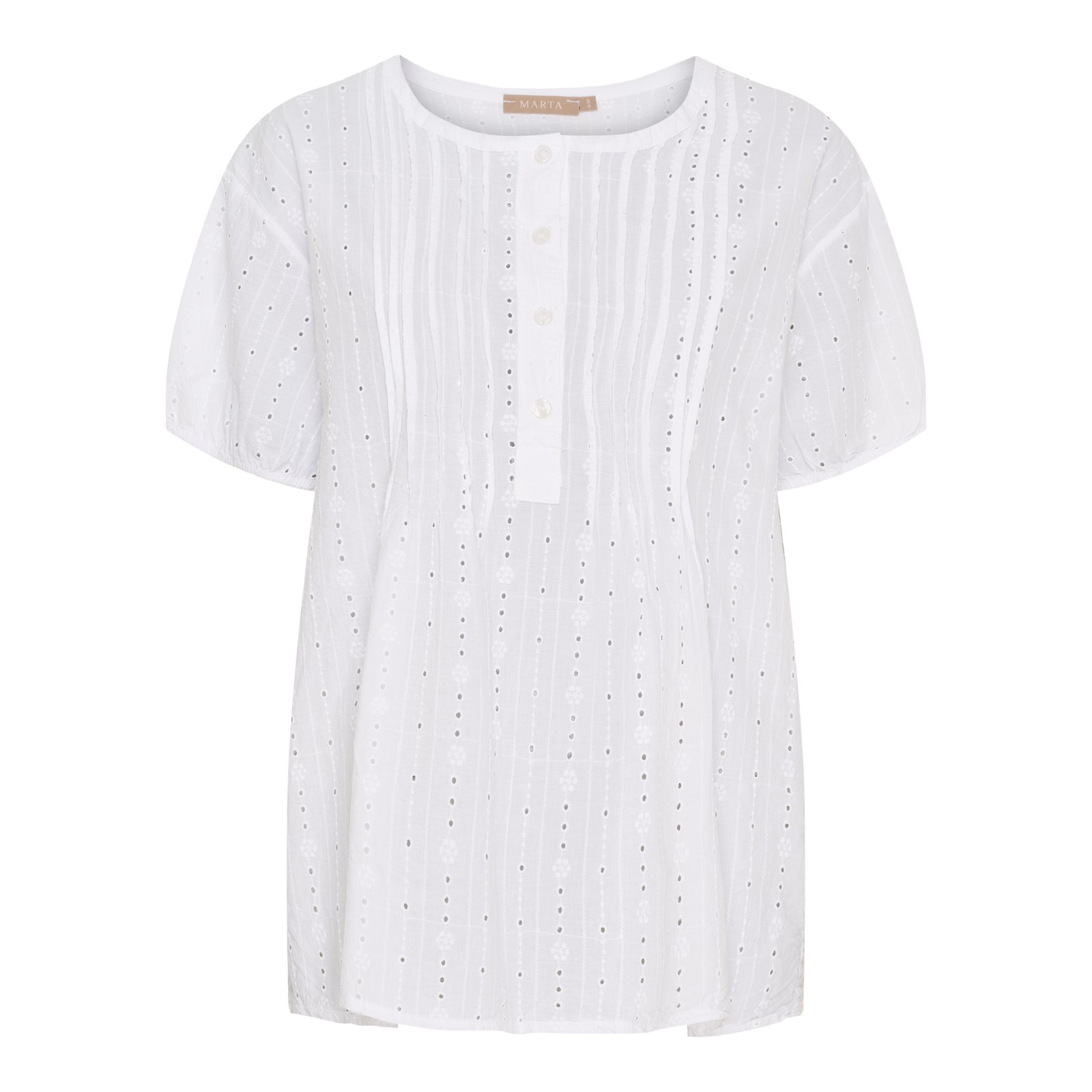 Smuk skjorte bluse fra Marta med korte ærmer der afsluttes med en smal elastik. Blusen har fine små broderier og hul mønster samt en læg detalje og knapper ned over brystet. Pasformen er løs og behagelig. Skøn forårs og sommer bluse.