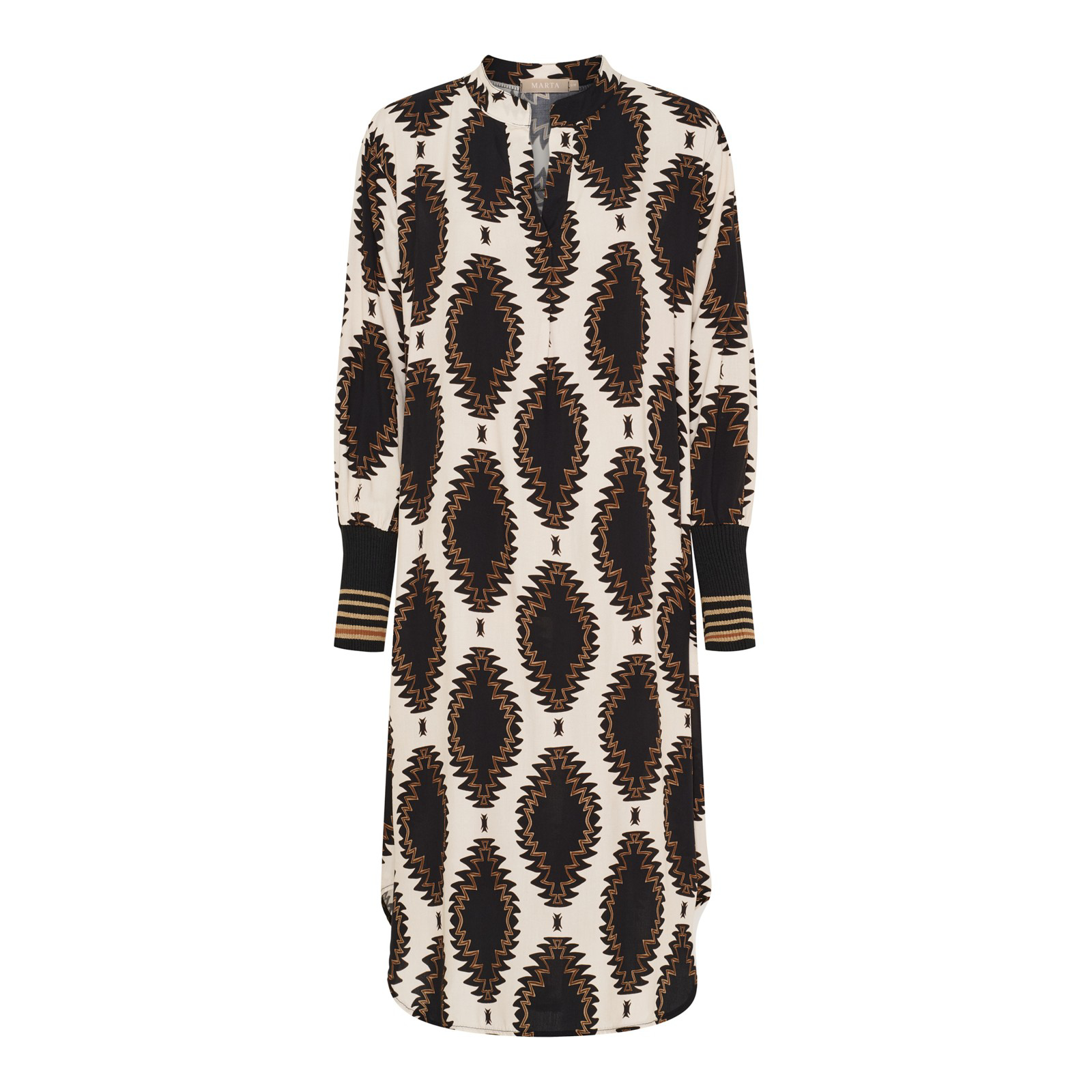 Kjole i afslappet pasform, perfekt til både hverdag og festlige lejligheder. Kjolen har midi længde og elegante 3/4 ærmer. Fremstillet af 100% viskose, der giver en behagelig og holdbar kvalitet.
