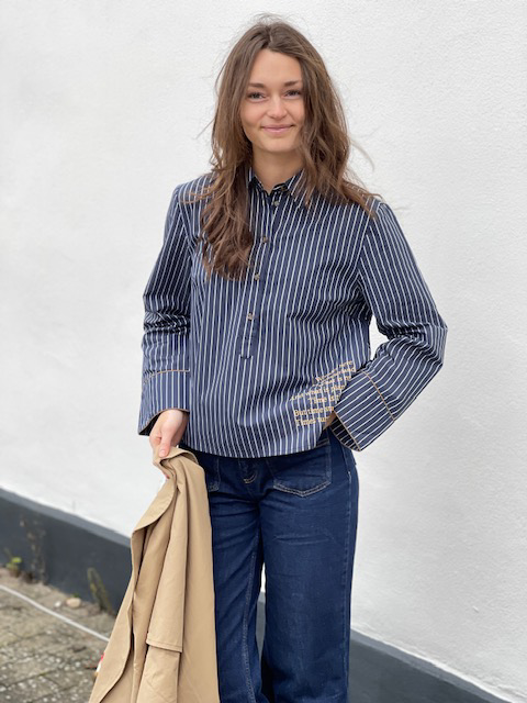 Super flot skjorte fra Culture med klassiske hvide striber og krave. Skjorten har lidt længde med slidser i siden og flot afrundet kant nederst. De påsatte bloster giver skjorten et feminnt touch.
