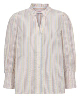 Frisk stribet Nümph skjorte. Denne skønne skjorte med multi farvede striber har en fin v-udskæring med flæsekant rundt. Ærmerne har en 7/8 længde med en bred smock kant. tyle den til dine ynglings jeans for et smart afslappet look.