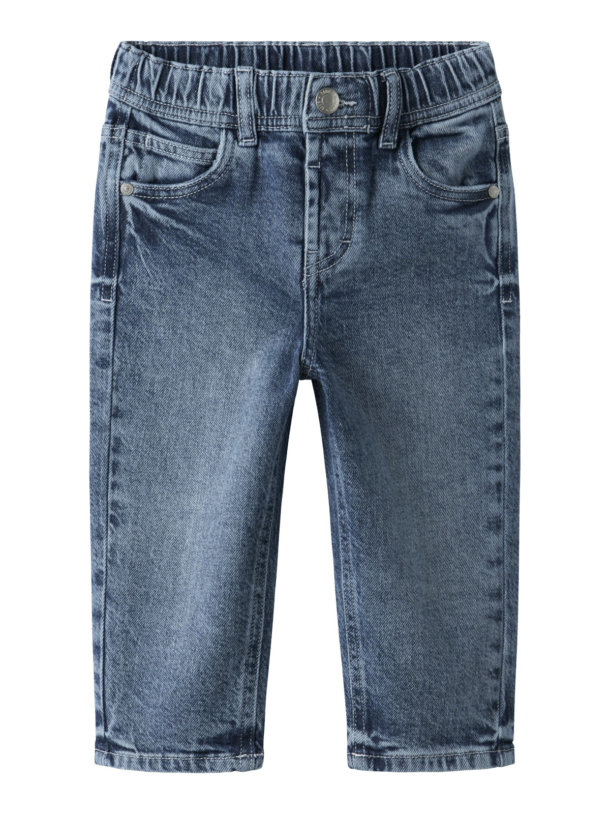 Name It Jeans i x-slim fit til dreng. De er i en lys denim med trykknaplukning og halv, falsk gylp.