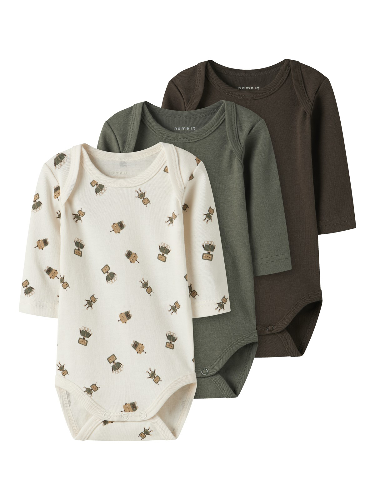 Lækker Hummel Body til dreng i en olivengrøn. Den har lange ærmer og praktiske trykknapper ved skulder og gylp.