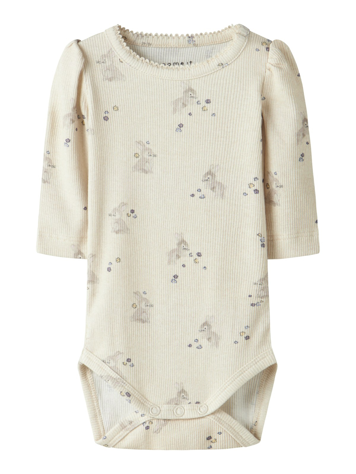 Super sød Hummel body i rosa eller grøn. Foran er der print med logo. Bodyen har lange ærmer med flæser, og den har praktiske trykknapper på venstre skulder og mellem benene.
