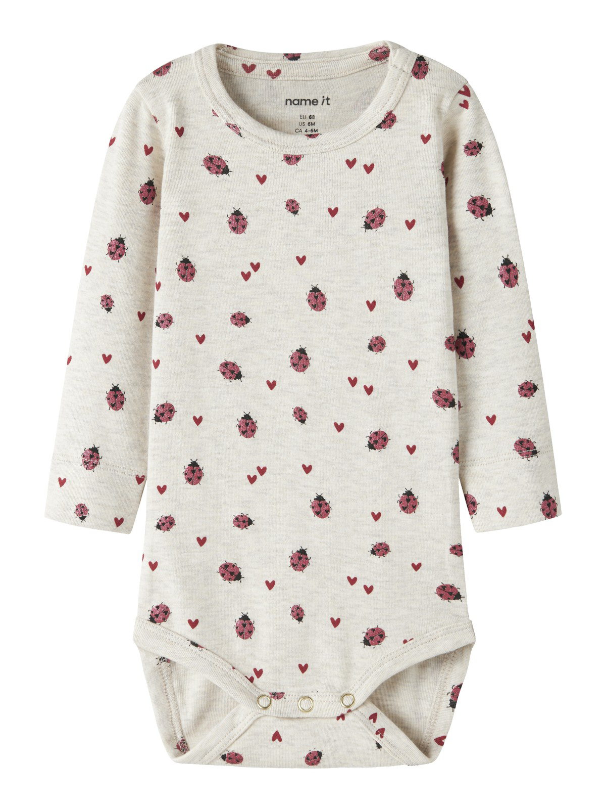 Sød Hummel Body fra Hummel til pige i råhvid med små Hummel logoer i forskellige farver over det hele. Den har praktiske trykknapper ved skulder og gylp.