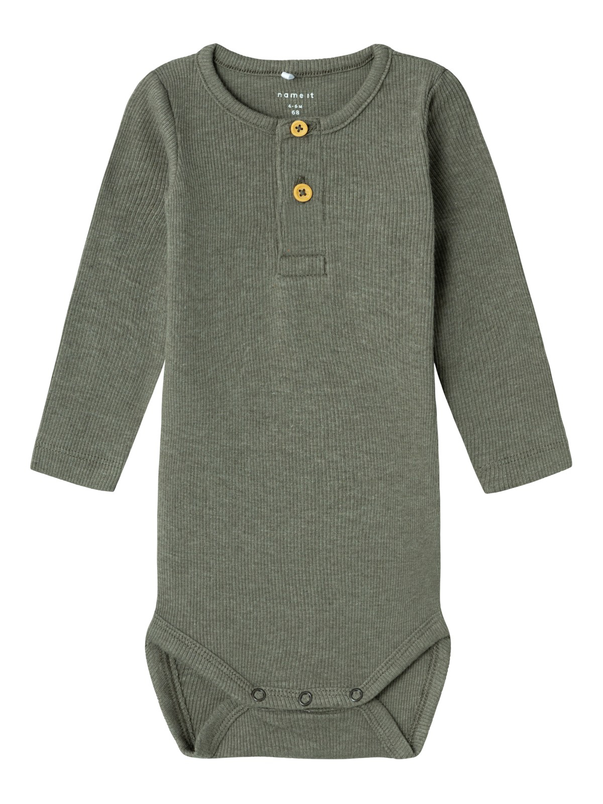 Lækker Hummel Body til dreng i en olivengrøn. Den har lange ærmer og praktiske trykknapper ved skulder og gylp.