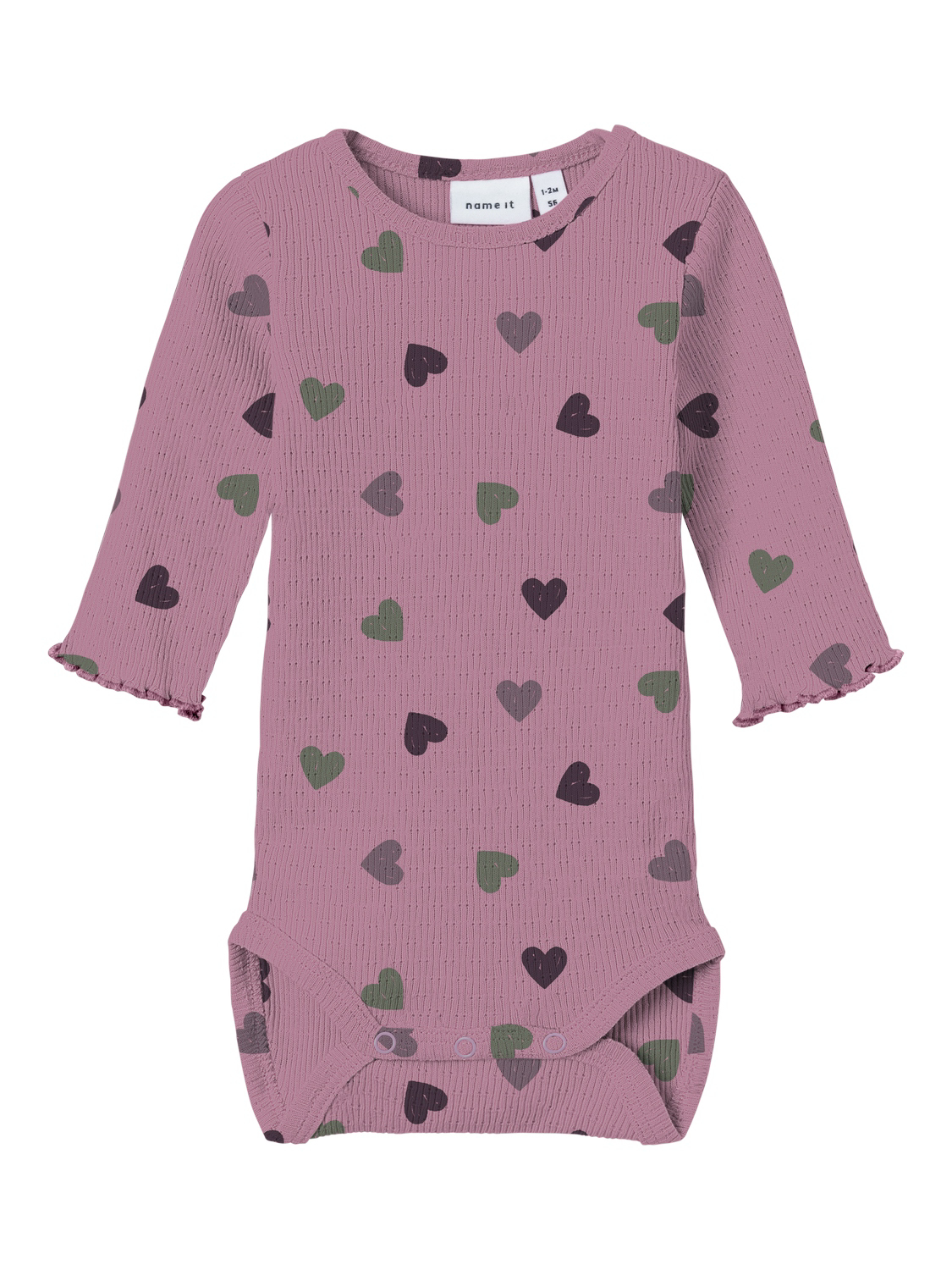 Super sød Hummel body i rosa eller grøn. Foran er der print med logo. Bodyen har lange ærmer med flæser, og den har praktiske trykknapper på venstre skulder og mellem benene.
