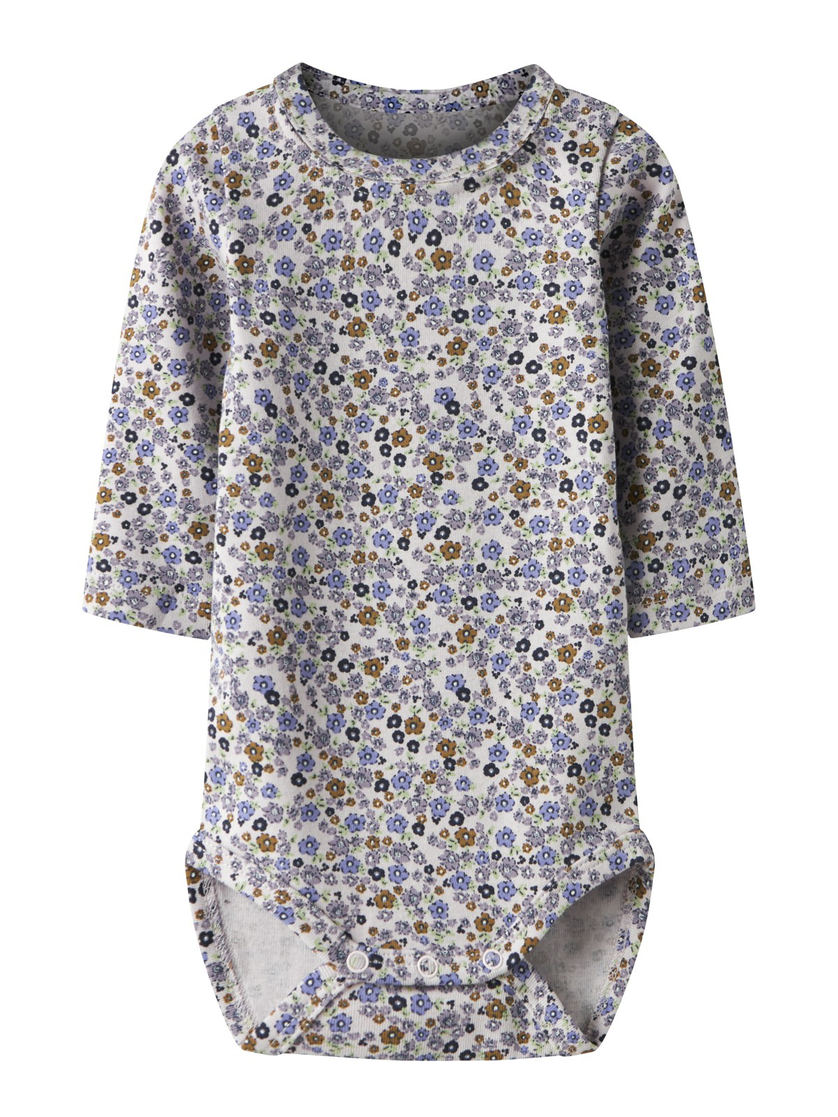 Sød Hummel Body fra Hummel til pige i råhvid med små Hummel logoer i forskellige farver over det hele. Den har praktiske trykknapper ved skulder og gylp.