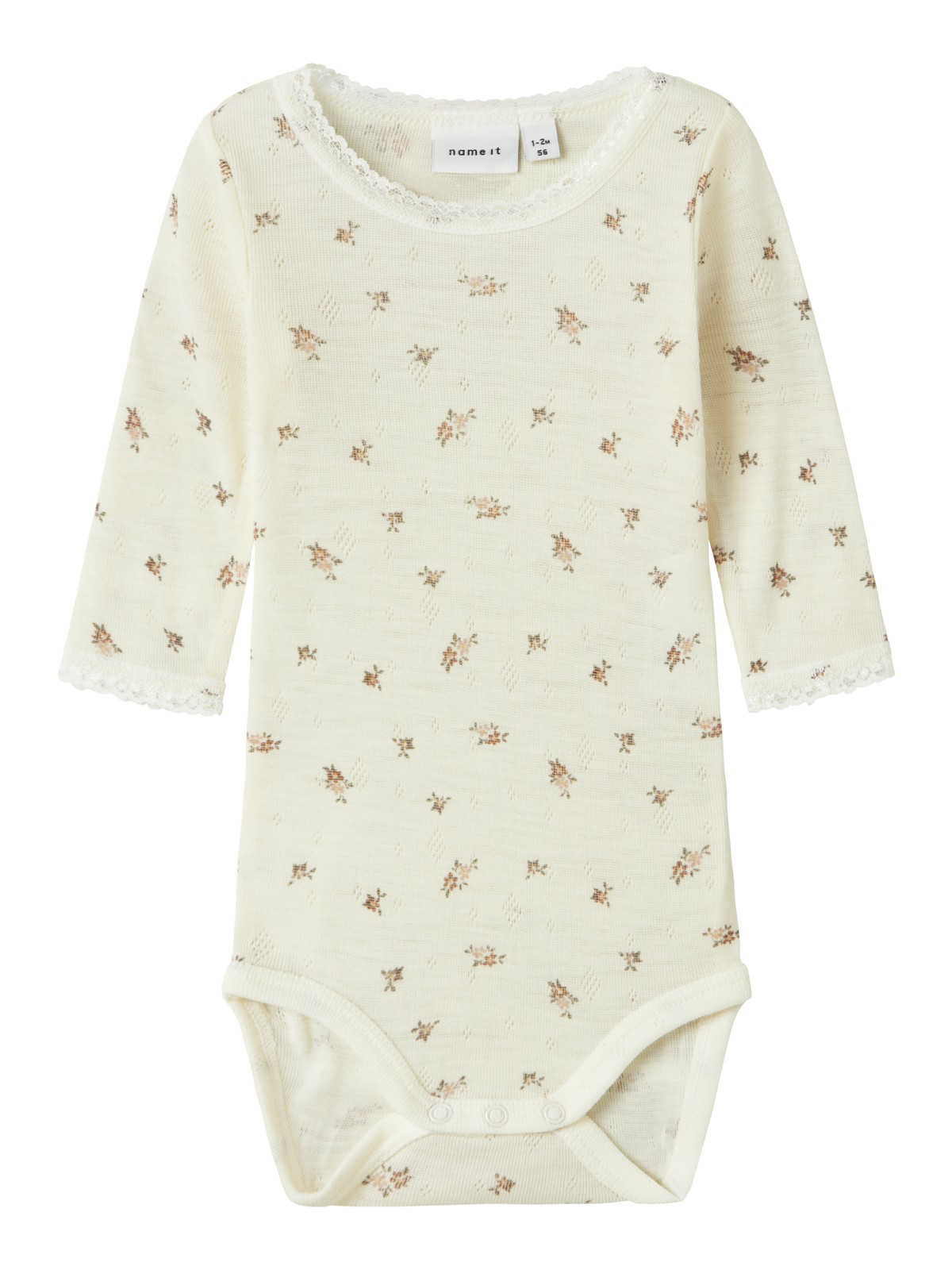 Sød Hummel Body fra Hummel til pige i råhvid med små Hummel logoer i forskellige farver over det hele. Den har praktiske trykknapper ved skulder og gylp.