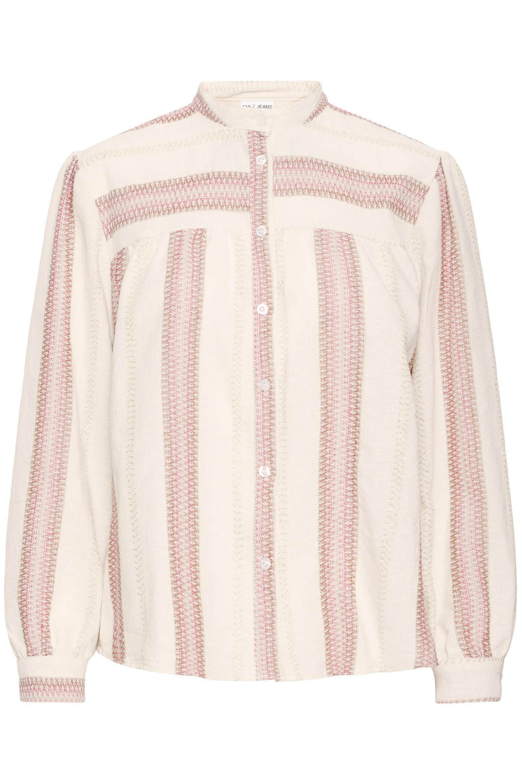 Skøn og trendy Culture skjorte med farverige broderinger. Skjorten har en klassisk krave med flip og lange æmer med en bred manchet. På hver sin side af stolpelukning og ned langs ærmerne er der de smukkeste broderier i et flot farvemix.