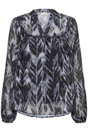 Smuk bluse fra Pulz Jeans i et smukt grå/sort grafisk mønster. Blusen har lange ærmer med en smal elastikkant og en flot v udskæring. Ærmer og det øverste på bærestykket er transparent.