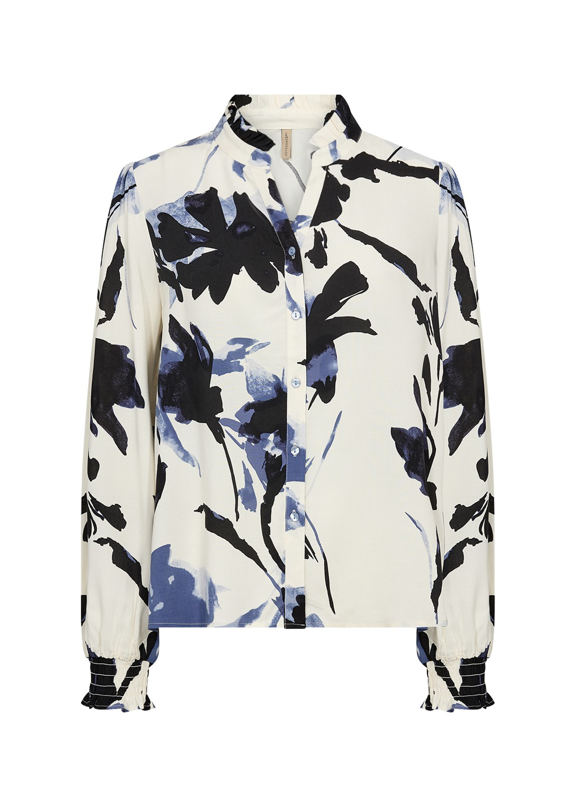 Smuk skjorte med fine blomster print og flæse- smock detaljer. Fåes i ass farver og gennemknappes.