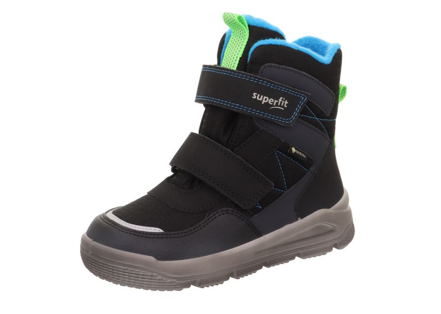 Superfit vinterstøvlerne lukkes med praktiske velcroremme over vristen, for let og hurtig tilpasning. Støvlerne har en fast hælkappe, og de er godt polstrede i åbningen. Indvendigt er de foret med fleece, og i bunden er der en blød og udtagelig indersål. I mellemlaget har støvlerne en Gore-tex membran som skaber et tørt og åndbart miljø for fødderne.