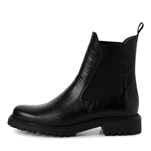 Håndlavet støvle, udført i sort lakeret skind med rund tå. Støvlen har elastiske sidepaneler og er dekoreret med en strop bagpå i sort præget skind med slangeskindsstruktur.